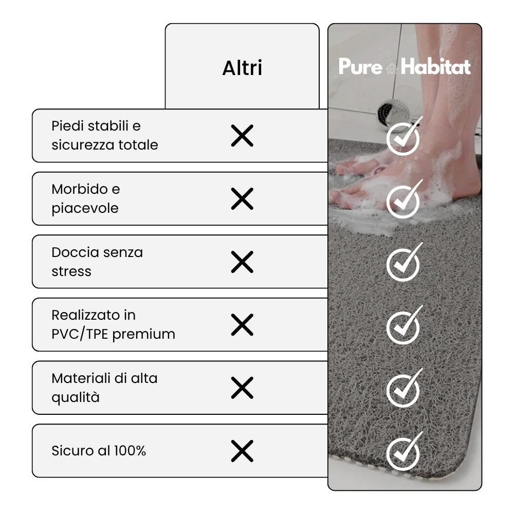 Il nostro Tappetino Antiscivolo per Doccia è dotato di una base ultra aderente che garantisce stabilità totale su qualsiasi pavimento bagnato.